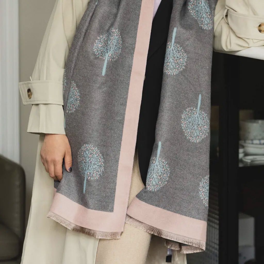 d Tree of Life Motif scarf, decorated with our special tree motif in lovely light pink and blue Such a prettyh scarf! Beautiful ligh hues with a Tree Of Life. For many the Tree of Life signifies the connections between earth, heaven and the spiritual. It's a thoughtful gift to give a friend or loved one and something that can be cherished for many years to come. With it's elegant style and luxe feel, this cashmere blend shawl makes a fantastic gift for mum, or perhaps for a special friend on their birthday.